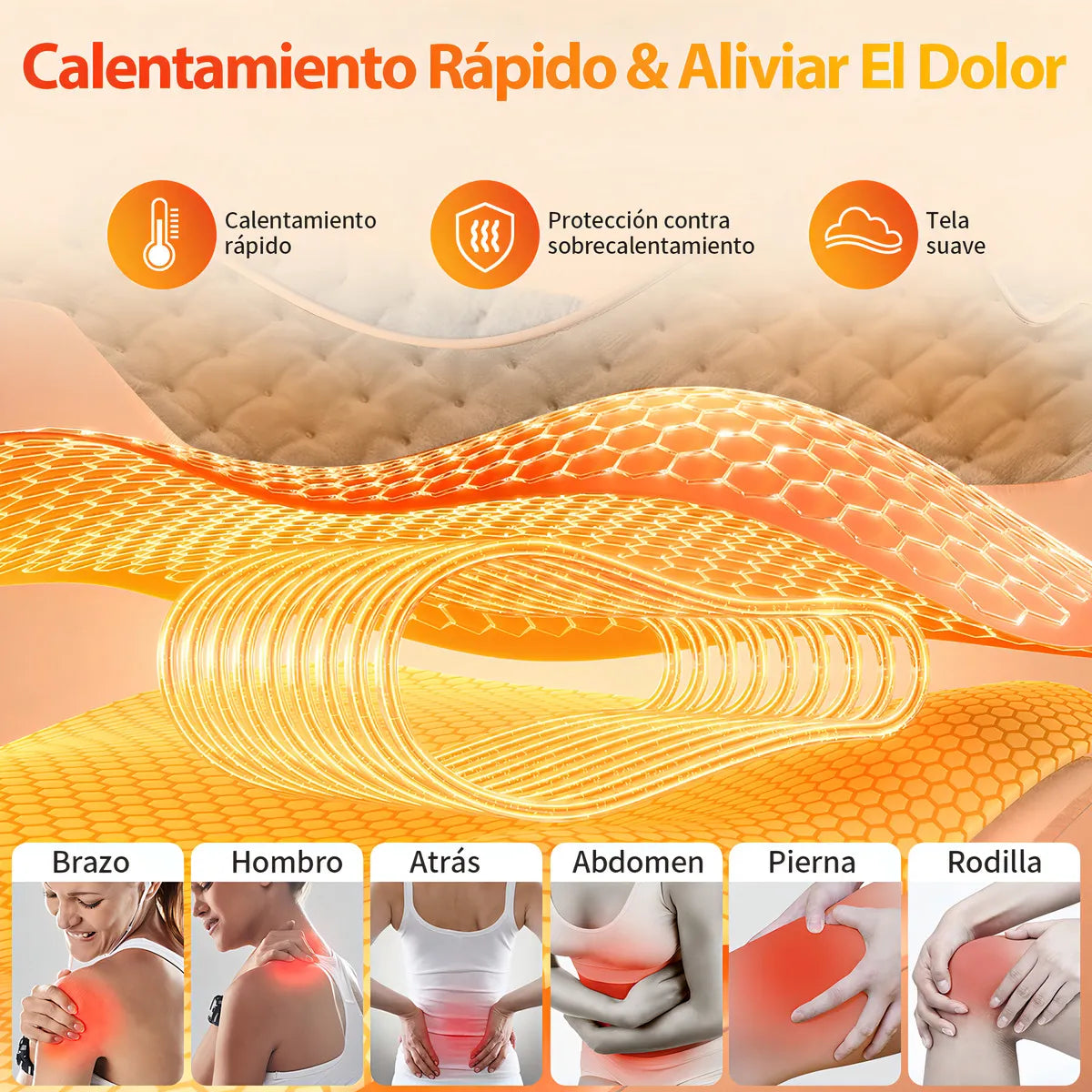 Aplica temperatura controlada en la zona lumbar para relajar fibras musculares, mejorar la circulación y disminuir la rigidez.