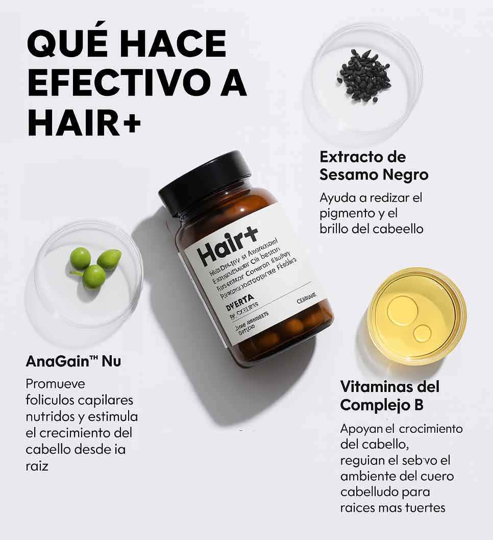 No. Hair+ está formulado sin hormonas, sin aditivos ilegales ni conservantes. Es apto para veganos, libre de gluten, soya y lácteos, lo que lo hace seguro para el consumo diario.